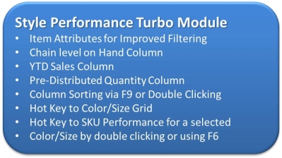 JDA and MMS are trademarks or registered trademarks of JDA Software Group. | Style Performance Turbo Module BrochureTake a high level look. Read Brochure PDF |